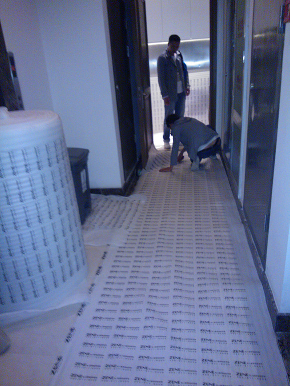 凡是在安装设备需要经过及堆放设备的地方,都无缝隙地铺上保护膜,图为先保护地面。